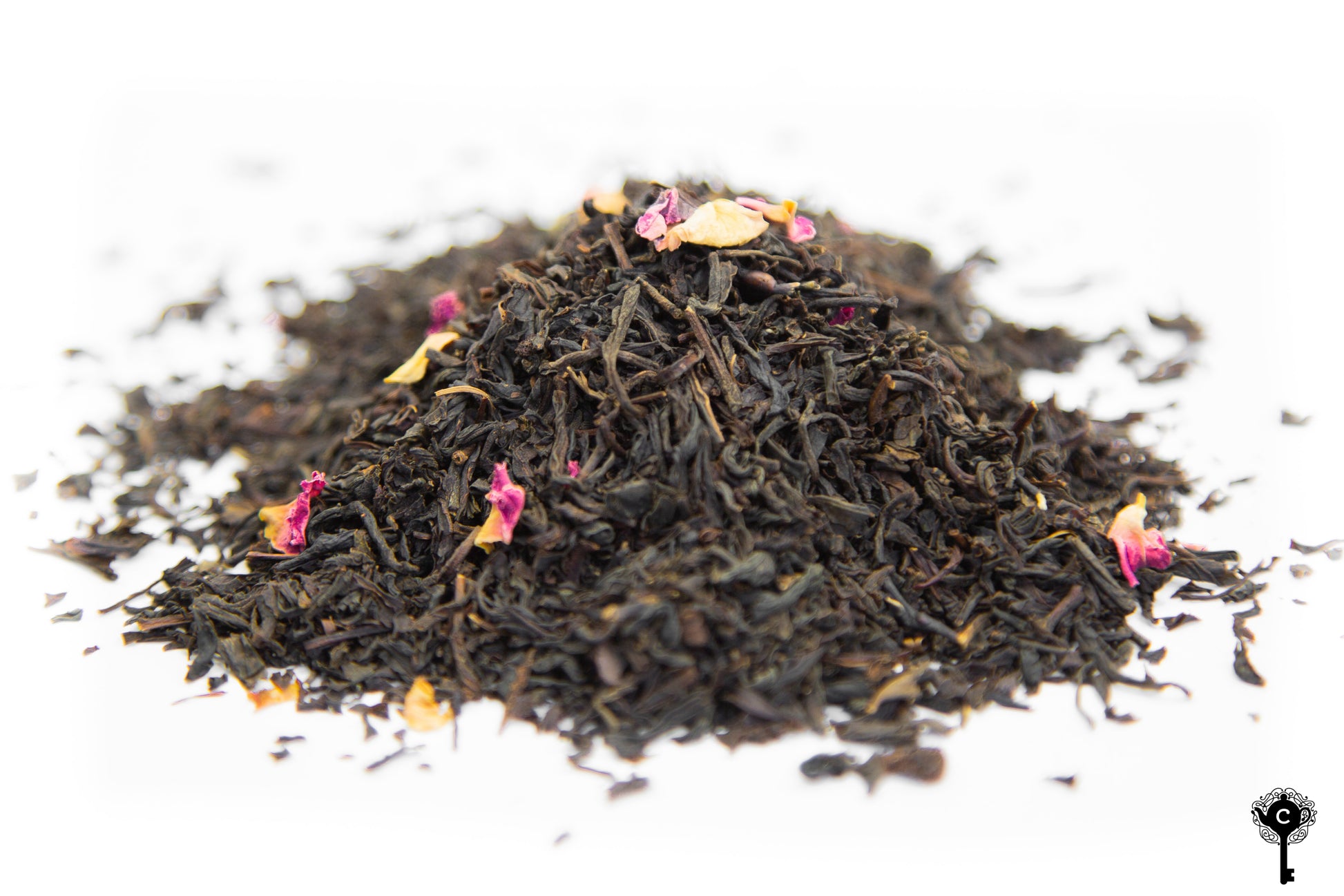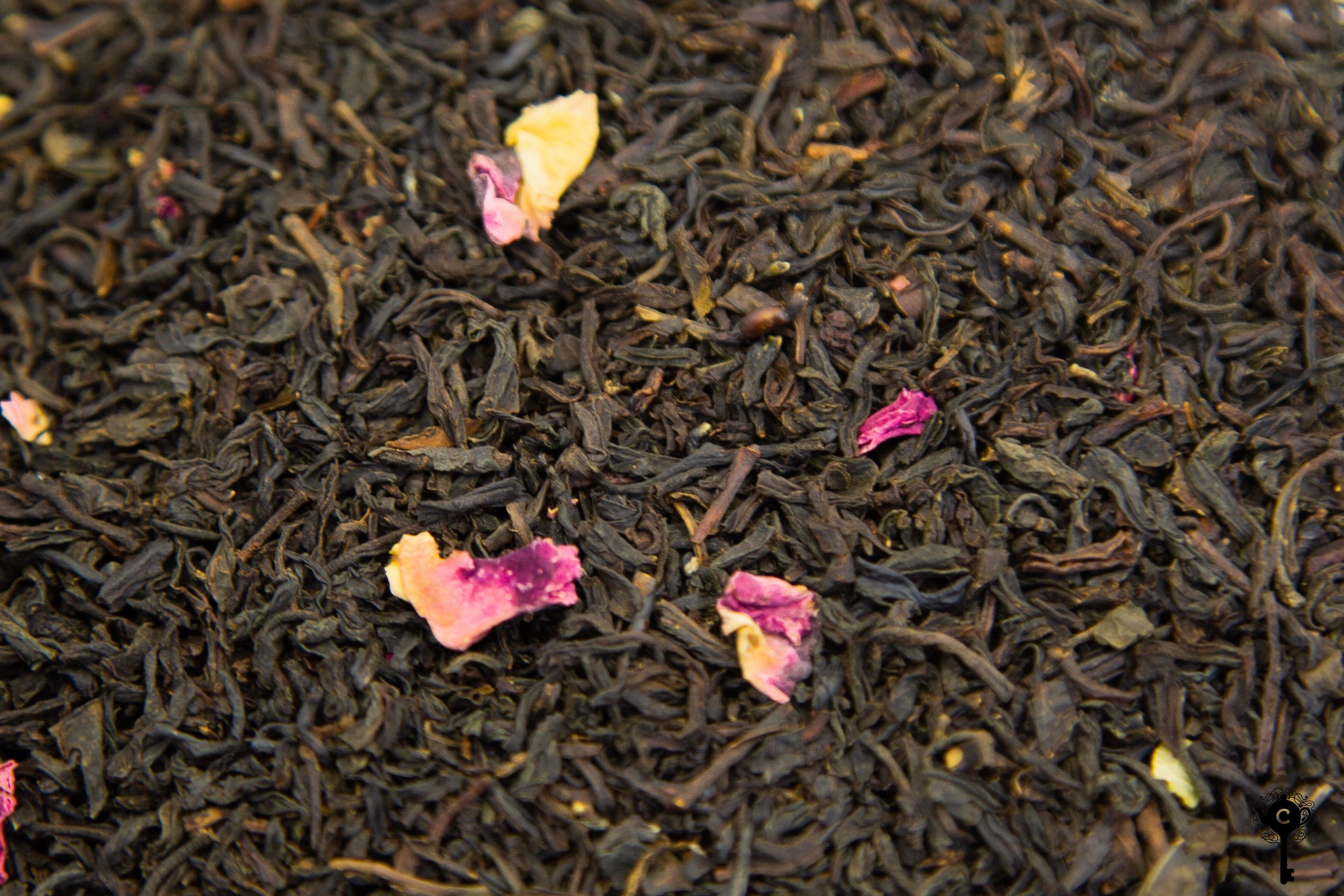 Ceai negru cu bucăţi de cireșe, petale de trandafir și aromă.